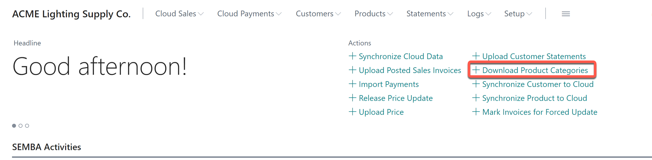 Download Product Categories action downloads all product categories from the Cloud Commerce to the Business Central. Cloud Product Categories are required to create a new product from the Business Central to Cloud.