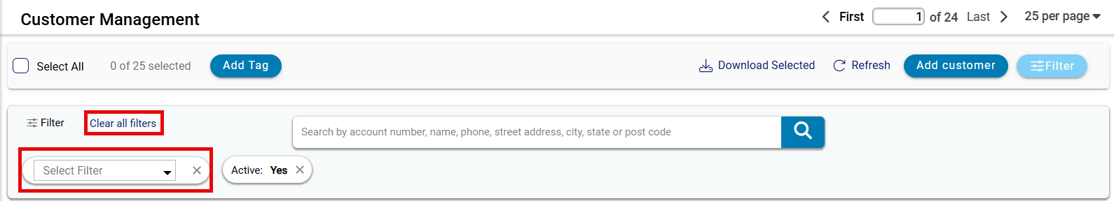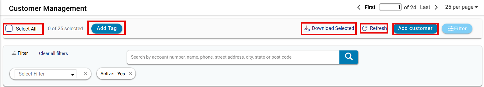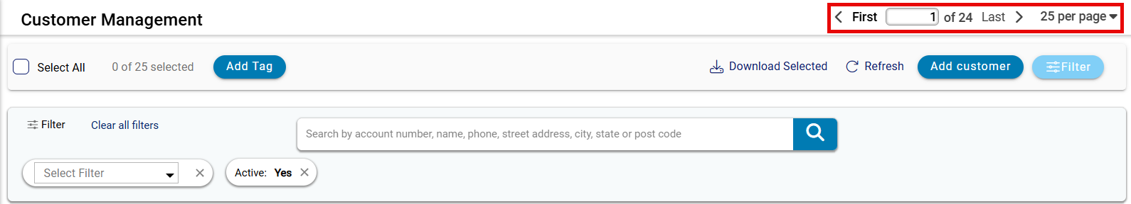 - Search Bar: Search by account number, name, phone, address, city, state, or postal code. Click the search icon to execute.