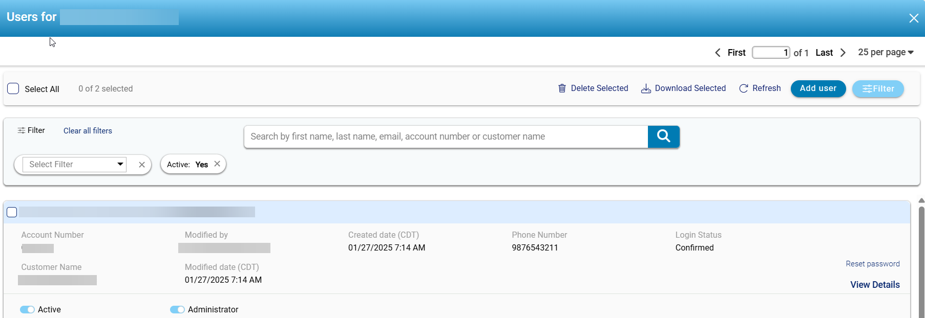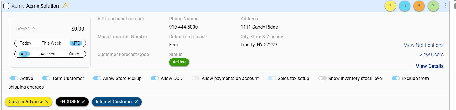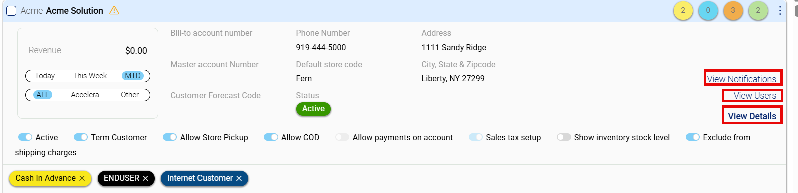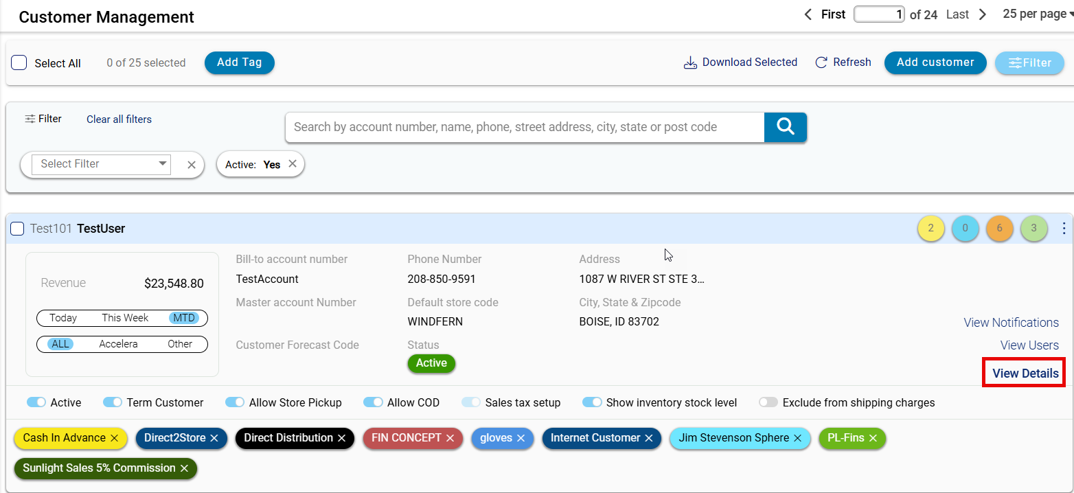 - View Users: Provides access to user management or account-specific user details. Refer to this link for more info on this tab Add a Store User for a specific customer