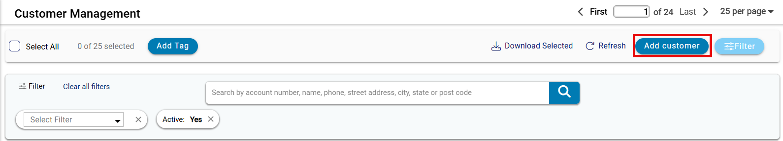 - Select All: A checkbox is available to select all customer records that are currently displayed on this page. By clicking this checkbox, you can easily select or deselect all records at once for your convenient management.