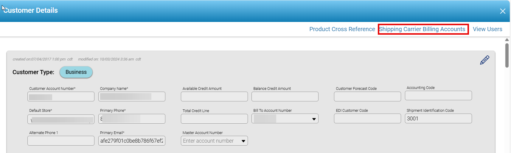 Customer Shipping Carrier Billing Accounts