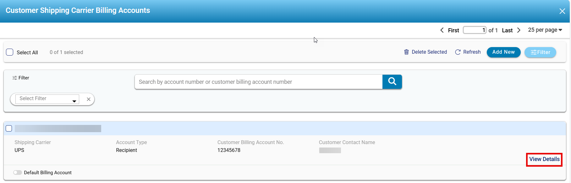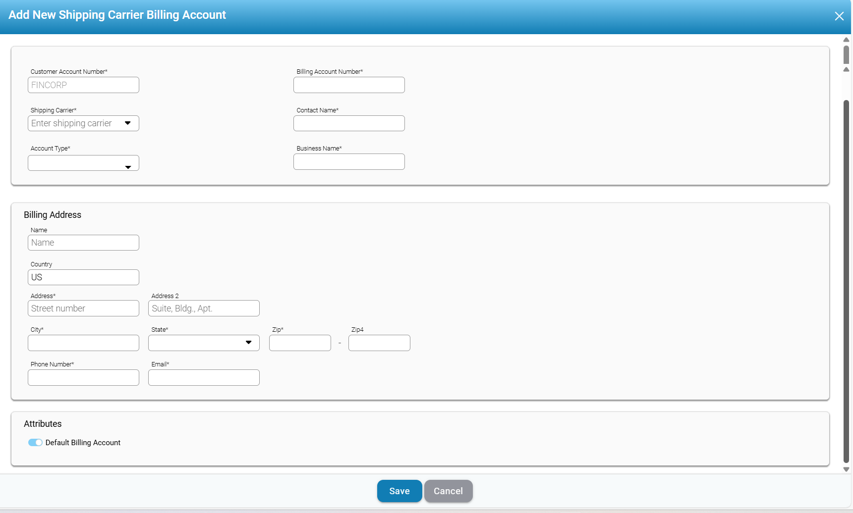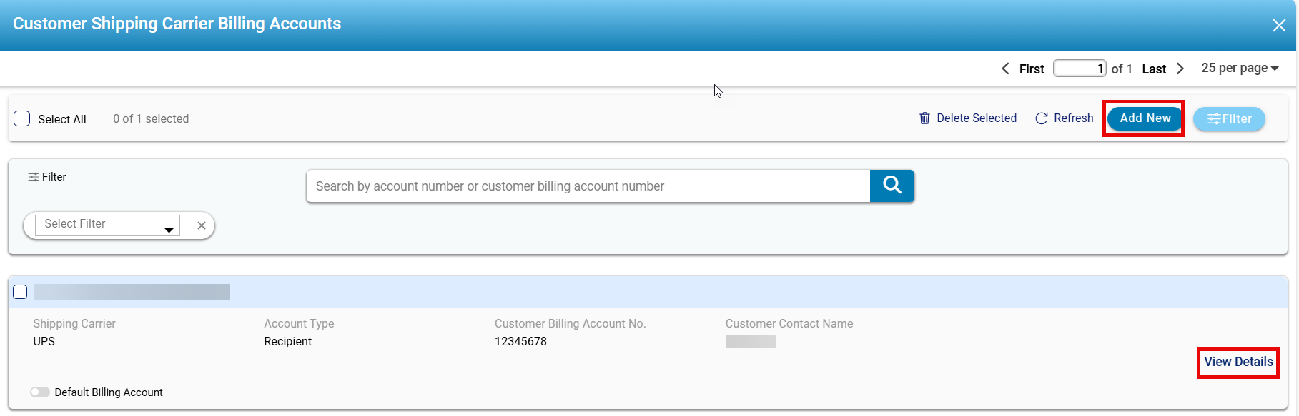 - Add New: Enables users to input a new shipping carrier billing account.