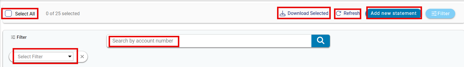 - A Select All checkbox at the top allows users to select all statements on the page, or they can select individual statements as needed. The number of selected statements is displayed next to this option.
