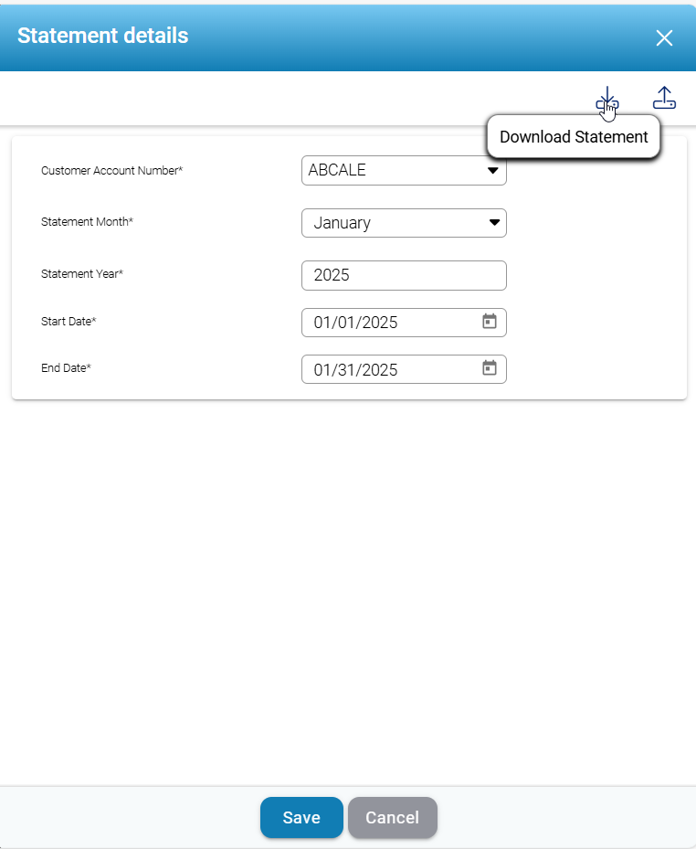 - Save Button: The Save Button is used to save the entered statement details. Clicking this button ensures that all inputs, such as the customer account number, statement month, and dates, are stored in the system.
