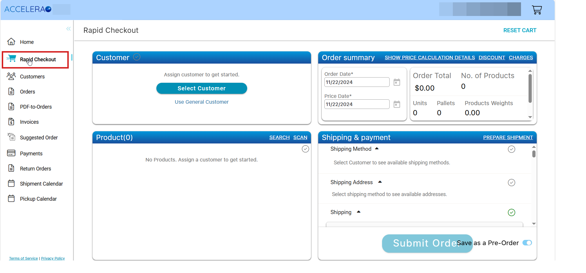 Begin by navigating to the Accelera Insight module to initiate the order creation process. This is the starting point for accessing the rapid checkout functionality.
