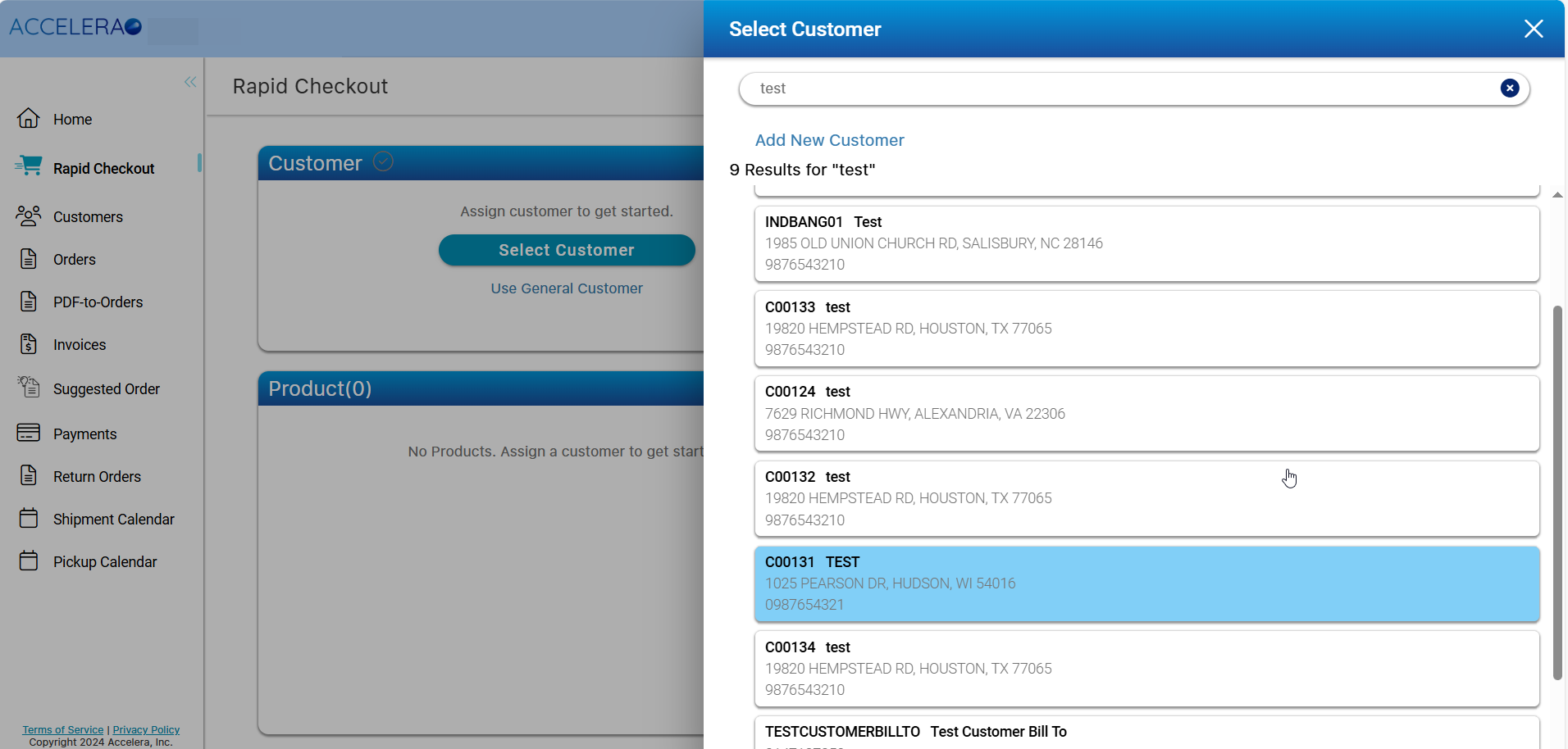 From the list, select the existing customer or use the search functionality to locate a specific customer. If the customer is not already in the system, you can add a new customer.