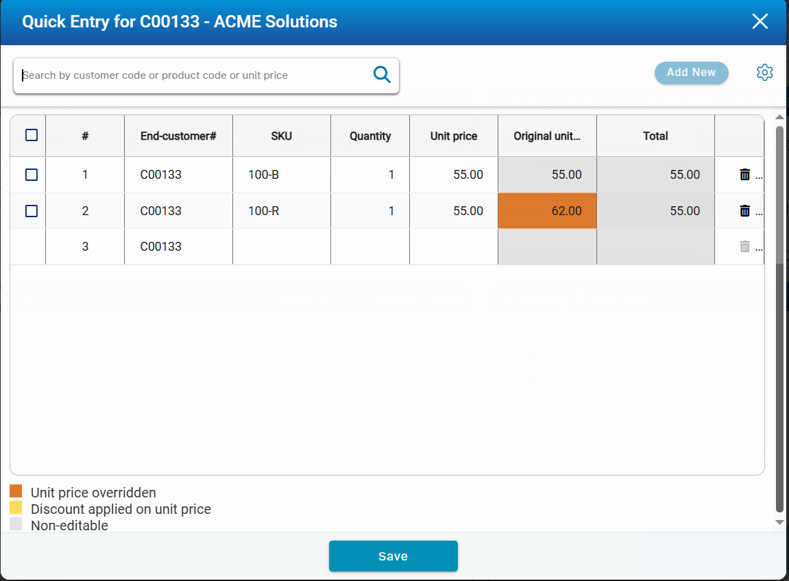 - Enables a streamlined way to add products directly by entering customer code, product code (SKU), or price into a grid-style interface.
