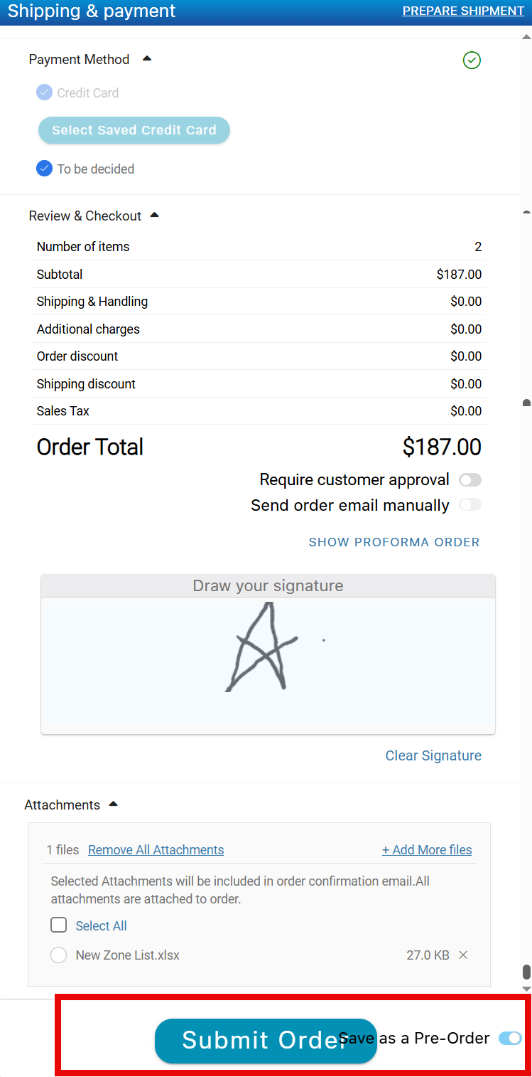 - Clicking this button finalizes the order submission. If the "Save as Pre-Order" toggle is enabled, the order will be saved for later processing instead of being submitted immediately.