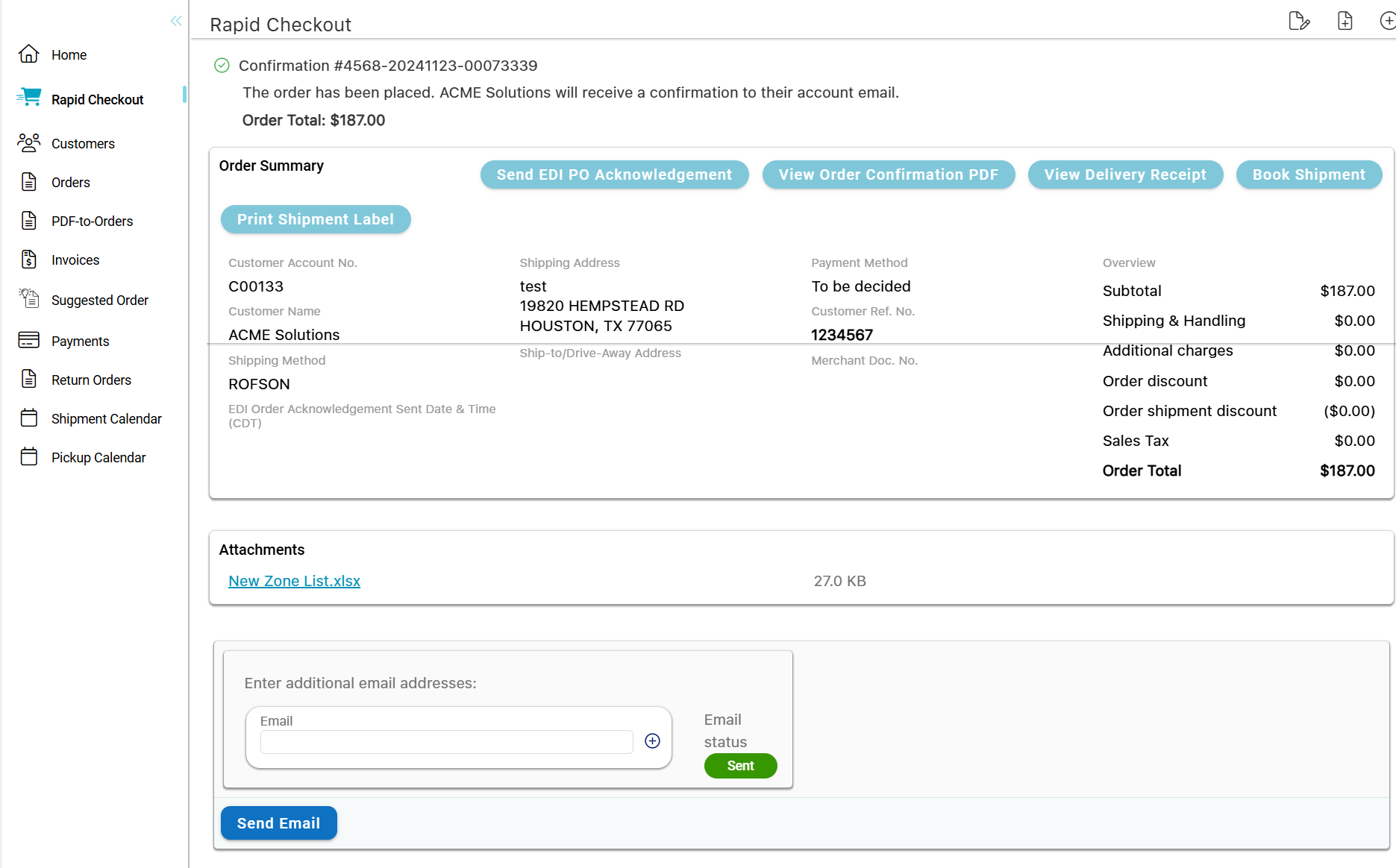 - Users can upload and view documents or files related to the order. This section may include options to add files, remove attachments, or select files to include in confirmation emails.