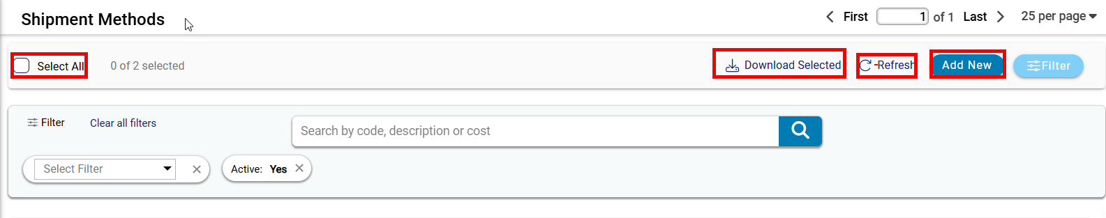 - Filter Section: The filter section helps you narrow down the shipment methods displayed in the list. You can apply filters based on shipment code, description, or cost. To reset all filters and return to the default view, click the "Clear all filters" option. The dropdown menu also lets you choose from predefined filter options for quicker searches. This makes it easier to find the shipment methods you need.