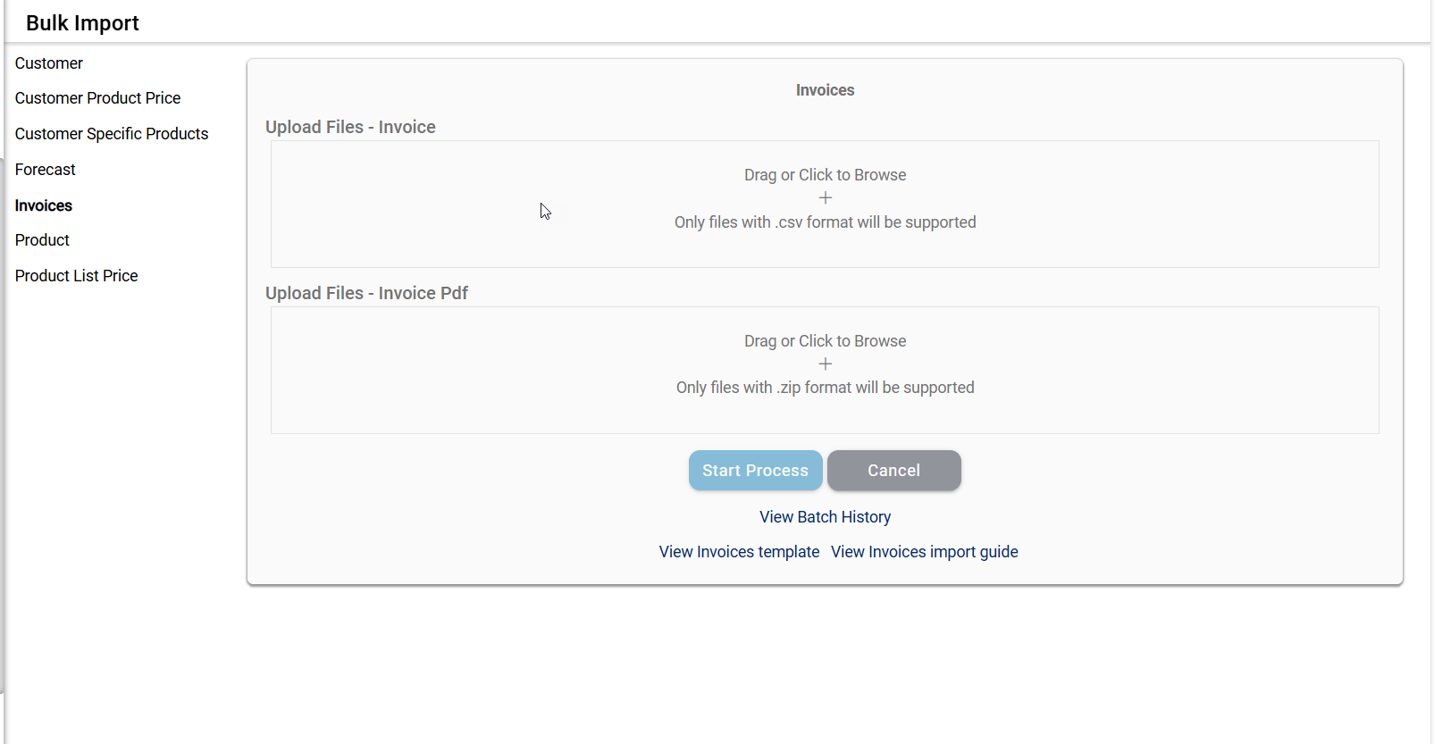- Action Buttons: Below the file upload section, there are two primary buttons: "Start Process" and "Cancel." The "Start Process" button will only be activated once a valid CSV file is uploaded. Clicking this button initiates the import process, validating and processing the uploaded data. The "Cancel" button allows users to exit the import process without uploading a file or making changes. These buttons provide control over the import process, ensuring users can review and confirm their actions before proceeding.