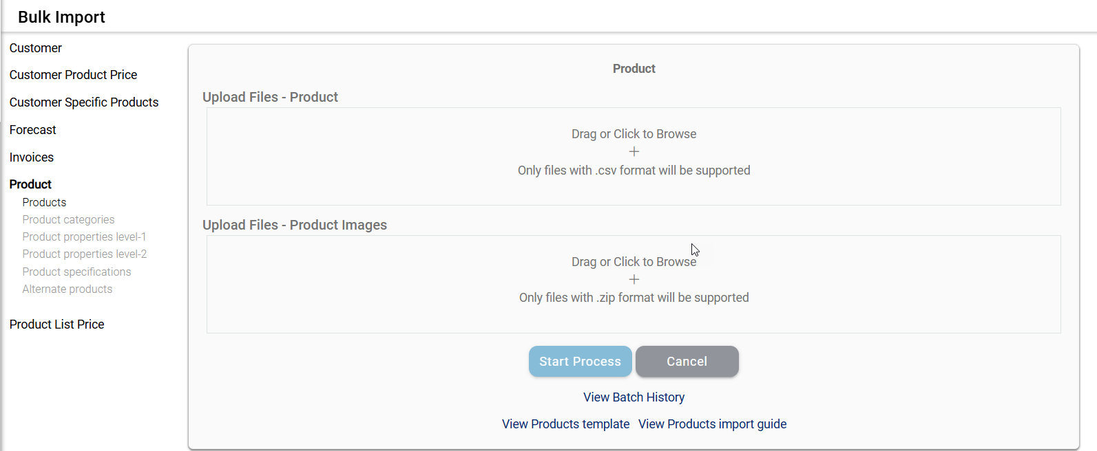 - Navigation Panel: The left-hand navigation panel contains multiple import categories, which are grouped under broader sections. The "Customer" section includes options for importing customer details and customer users. Other sections include "Customer Product Price," "Customer Specific Products," "Forecast," "Invoices," "Product," and "Product List Price." Each option allows users to import specific datasets into the system based on predefined formats. Selecting a category updates the main panel to display relevant import options for that specific data type. This layout ensures efficient navigation between different types of bulk imports.
