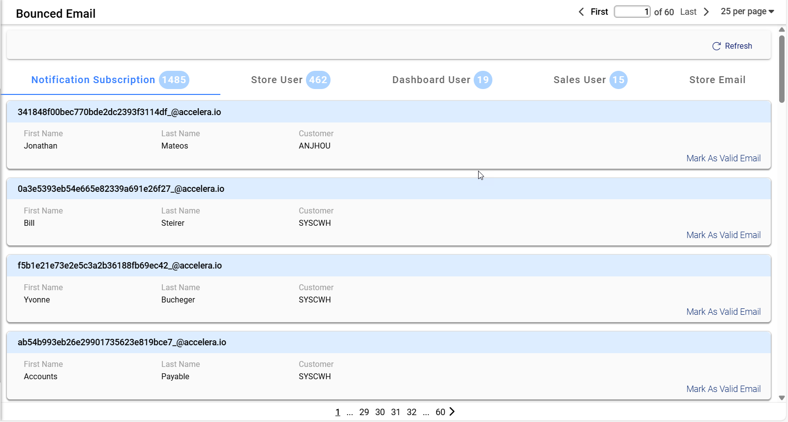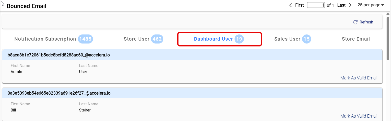 This section serves as the header for the displayed data, indicating that the listed email addresses have encountered delivery failures. The section provides a categorized view of bounced emails based on user roles, enabling efficient filtering. Users can navigate through the categories to identify specific cases of bounced emails. The inclusion of a refresh button allows real-time updates to the displayed data. The pagination controls at the top enable users to browse through multiple pages of records.