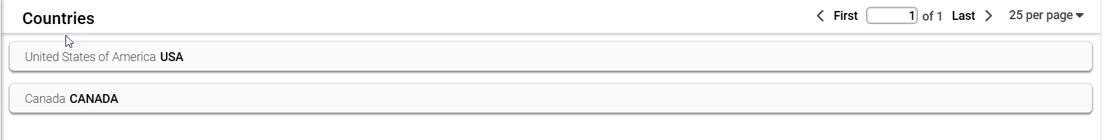 - Although the list is limited to two countries, the interface includes pagination controls and a “25 per page” dropdown. These elements are part of the standard layout and are designed to support scalability. While currently non-functional due to the small dataset, these controls will become useful if more countries are added.