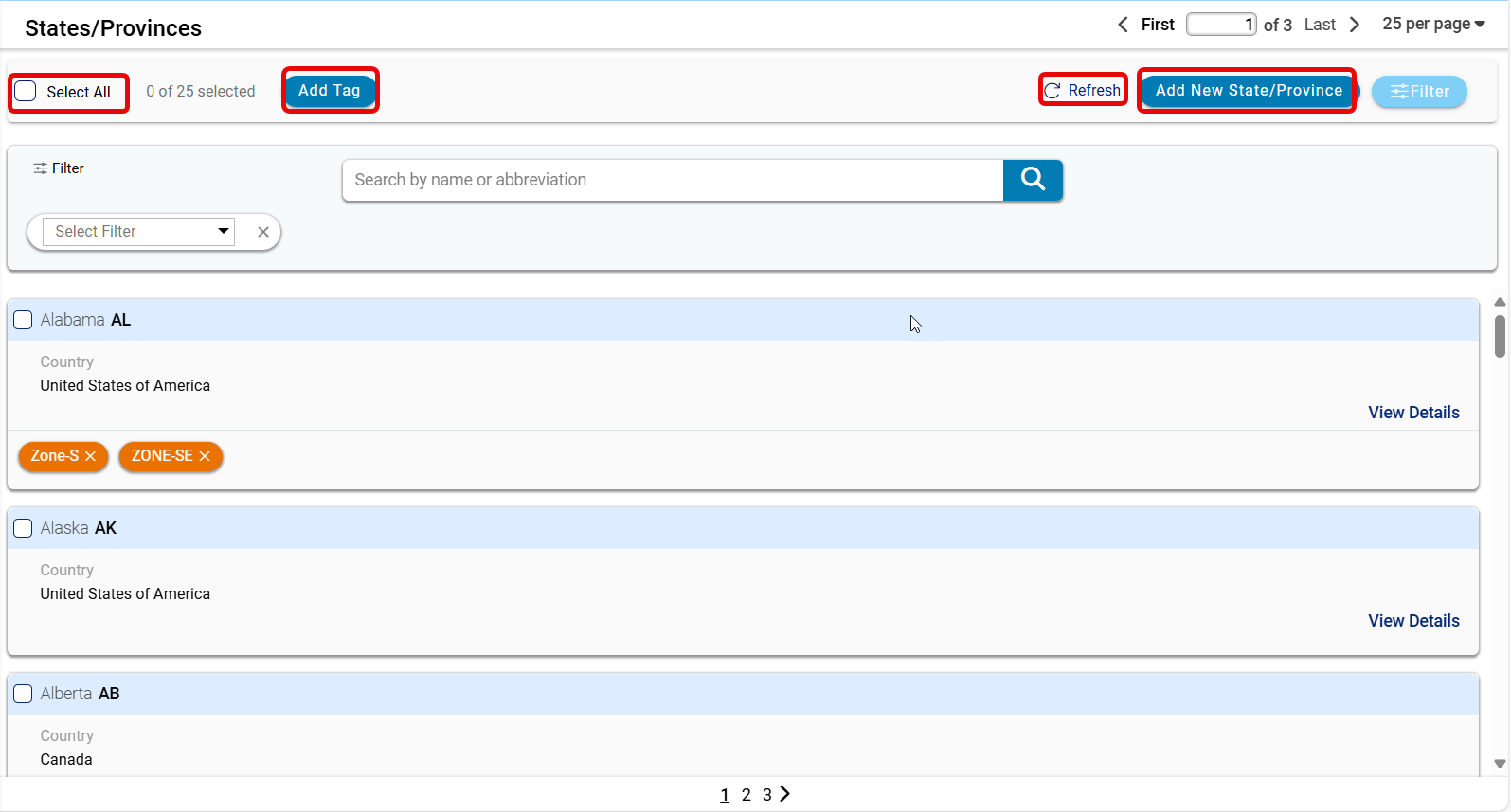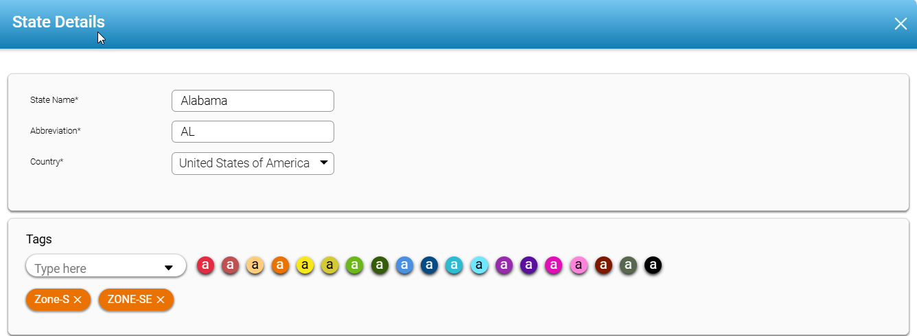 The system already sets up and manages the countries in the platform. Users cannot add or change them directly, keeping data consistent and controlled. Users can, however, add and manage states or provinces within each country, providing some flexibility. Each state includes important details like its name, abbreviation, country association, and optional tags for further categorization.