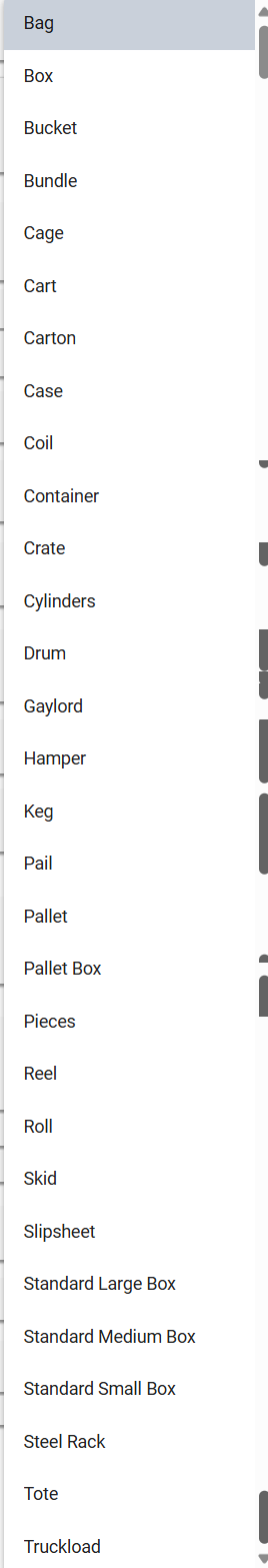 - Shipping Package Type: This dropdown allows the user to select a predefined shipping package type from an extensive list. Options include various container formats such as Bag, Box, Pallet, Crate, and others. Each option corresponds to a specific physical packaging method used for transportation or storage. Selecting an appropriate type helps maintain consistency in shipping records and logistics documentation. The dropdown ensures that only valid types are chosen, reducing data entry errors.