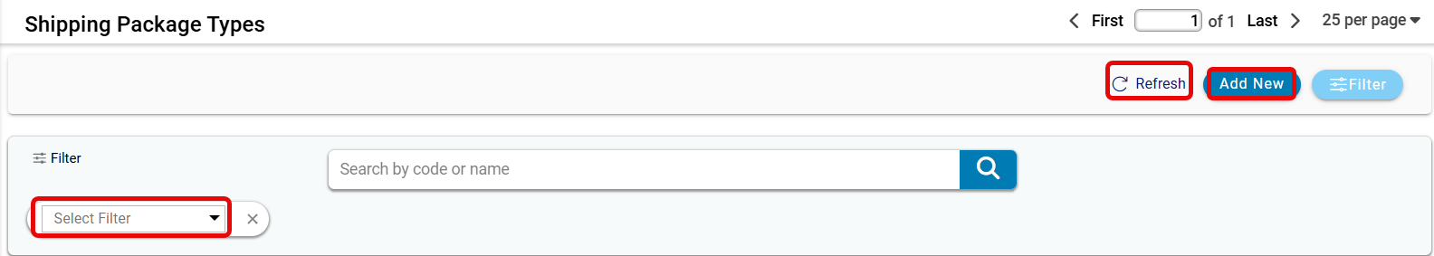 - Search Bar (Search by code or name): The search bar allows users to locate specific shipping package types by entering either the code or name field. As the user types, the system may refine the displayed results to match the query. This function is essential for quickly accessing specific records without scrolling through the entire list.