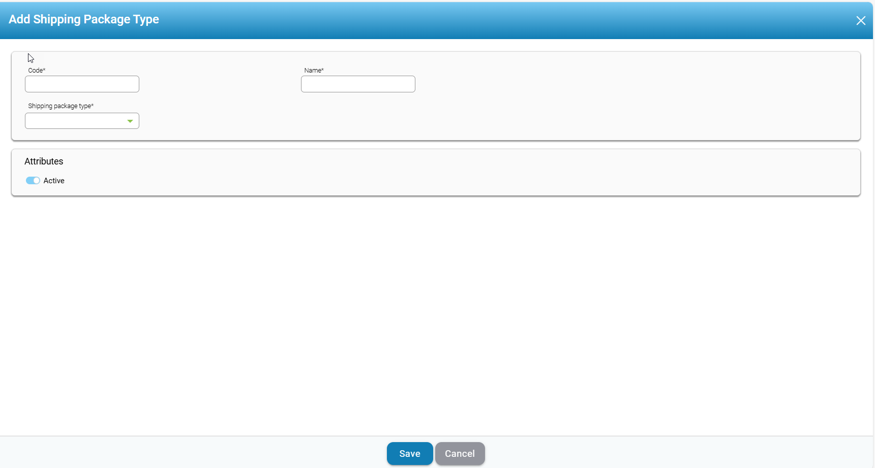 - Active: The Active toggle under the "Attributes" section is used to control the availability status of the shipping package type. When set to "Active," the package type is available for use in operations and transactions. If deactivated, the package type is hidden from standard workflows but retained in the system for record-keeping. This toggle helps manage the lifecycle of shipping package types without deleting them. The control ensures that outdated or unused types can be excluded from active usage while preserving historical data.
